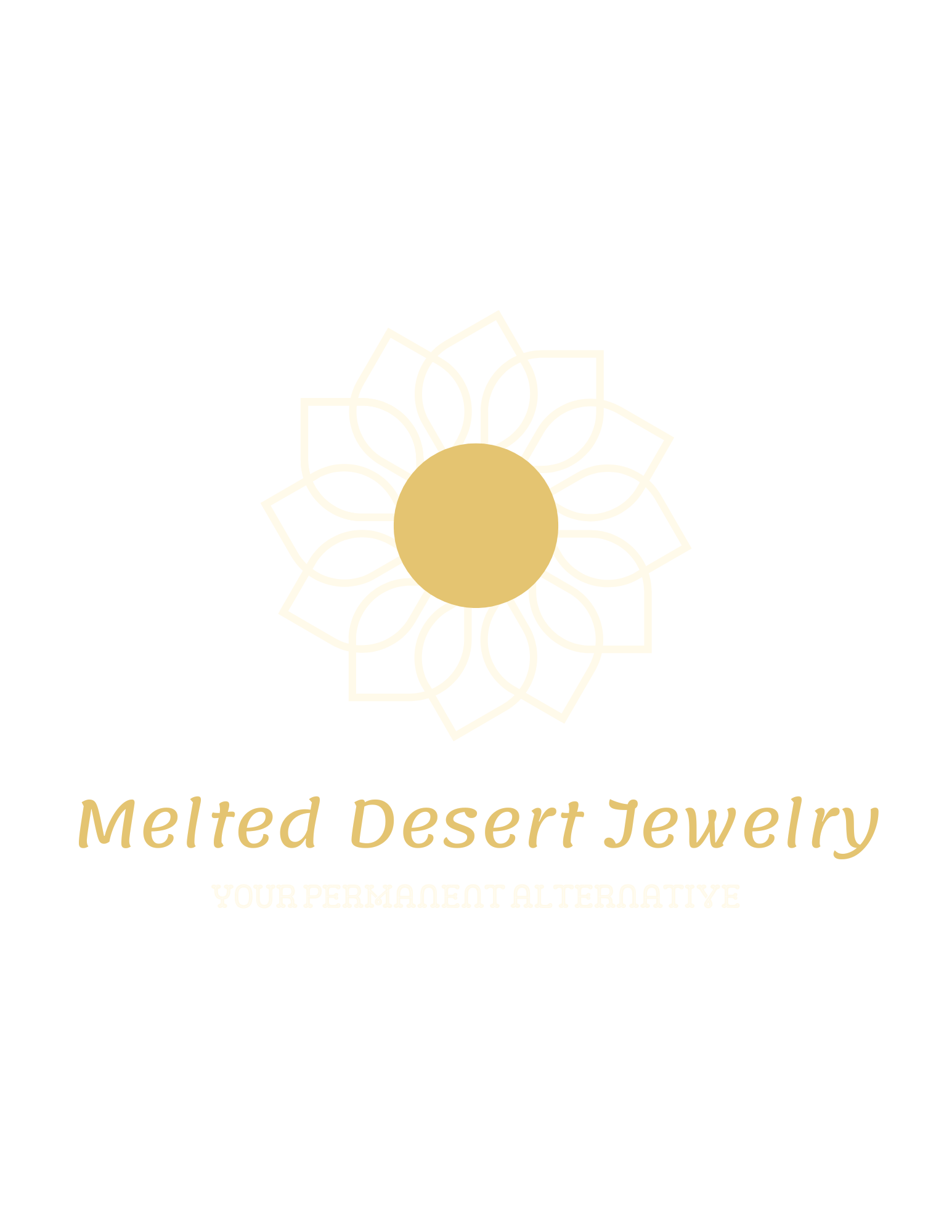The Melted Desert Jewelry logo features a white minimal desert flower with a bright yellow center set against a neutral blue background, reflecting a refined simplicity that mirrors the brand’s permanent jewelry alternative. This elegant, modern mark captures Melted Desert’s unique offerings—subtle luxury, lasting style, and a thoughtfully restrained aesthetic that feels both distinctive and timeless.